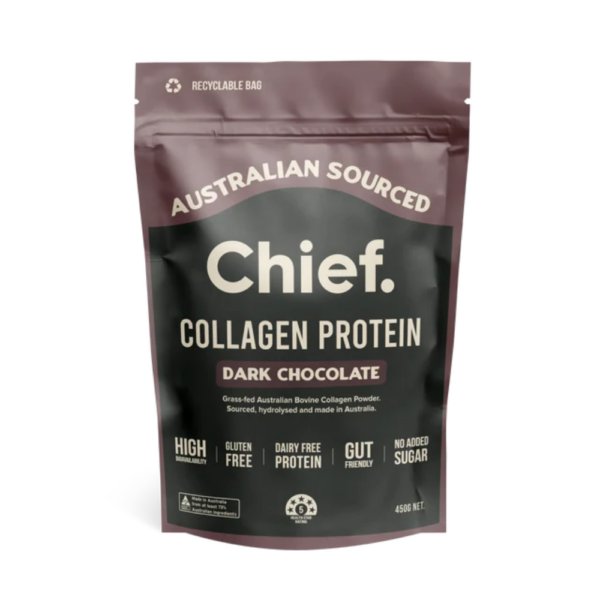 Increase your daily protein intake while supporting glowing skin, stronger nails, muscle recovery, joints and tendons, and your gut health with clean Collagen Protein! Containing type I and III collagen with an average molecular weight <1kDa (highly bioavailable), Chief collagen dark chocolate protein is a deliciously rich dark chocolate flavour combining the antioxidants of raw cacao with the subtle sweetness of monk fruit. Great as a chocolate ‘milk’ (e.g. Milo replacement), as a hot chocolate, with yoghurt, in your smoothie, or with your coffee! You can even bake with it.