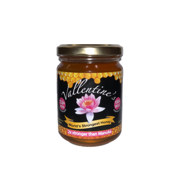 The worlds strongest honey! Even 2 times stronger that Manuka honey. Directly from Byron Bay, this raw unfiltered vallentine’s honey contains over 80 essential micronutrients. It works as anti-inflammatory, expectorant, antibacterial and antifungal. Effective in fluid or crystal form, it is the perfect natural medicine against colds and flu, sore throat, wounds and burns.